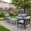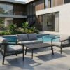 Ensemble cafe 4 pieces avec sieges coussines et table 25”x43” sur cadre aluminium leger.