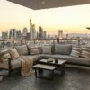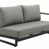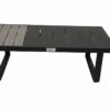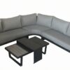 Ensemble 5 pieces avec sieges coussines, dossiers en rotin et tables en aluminium.