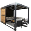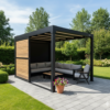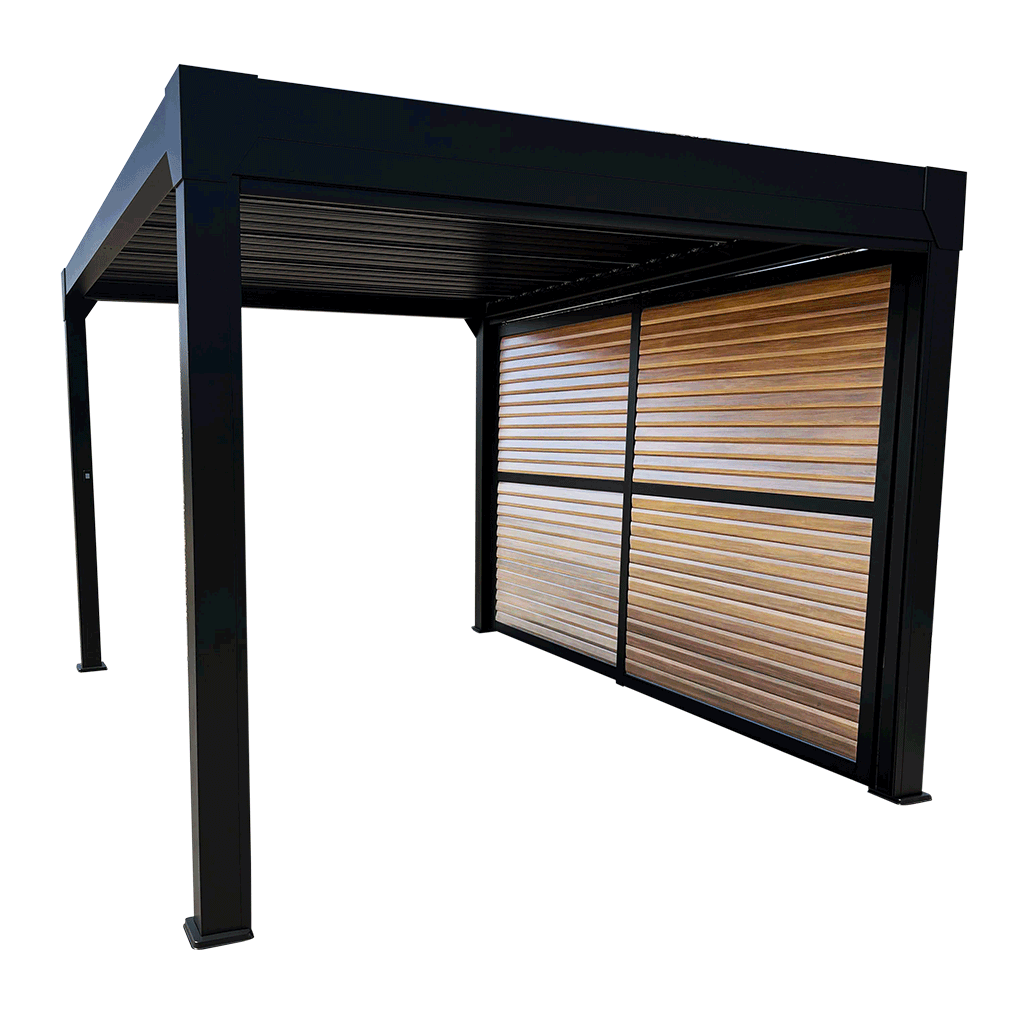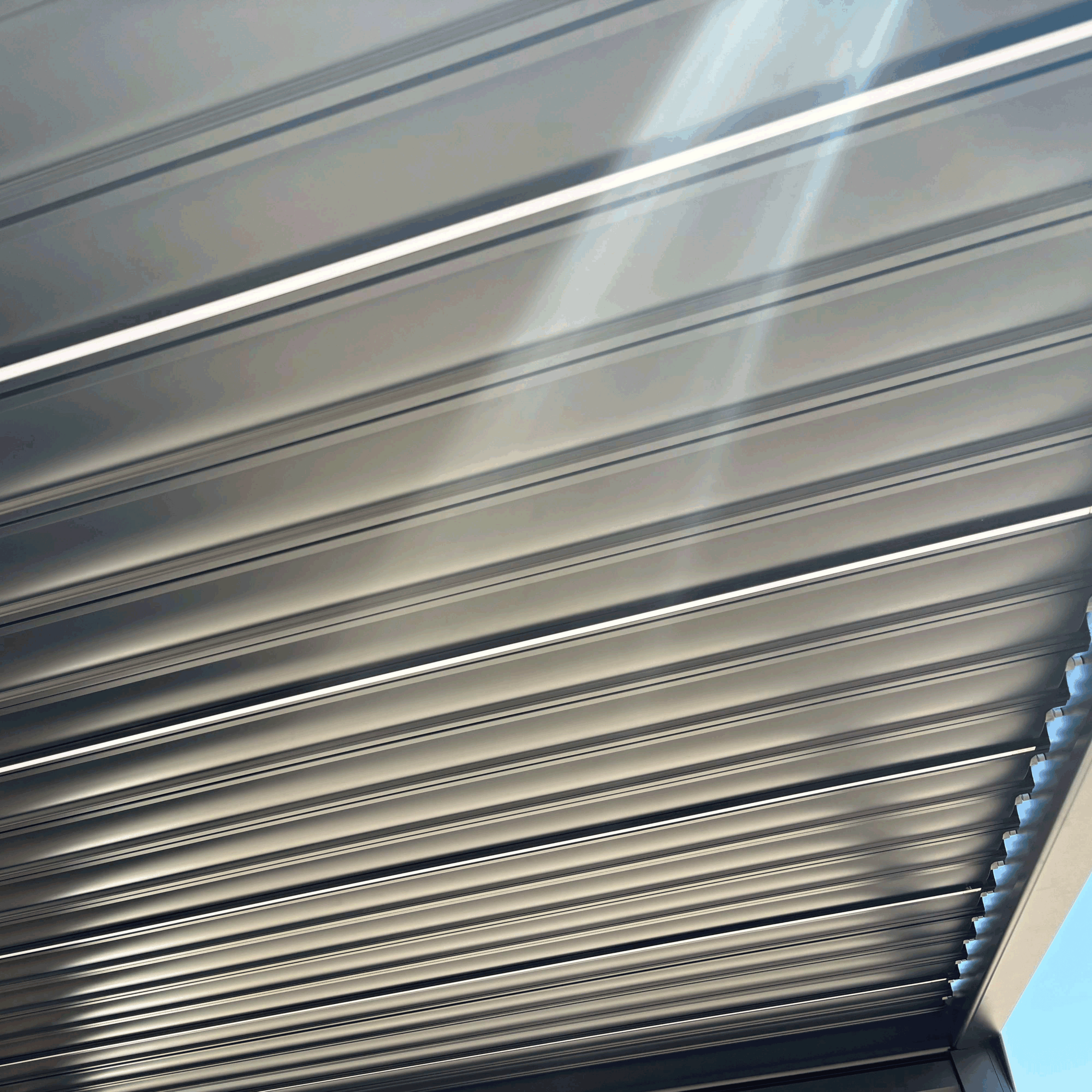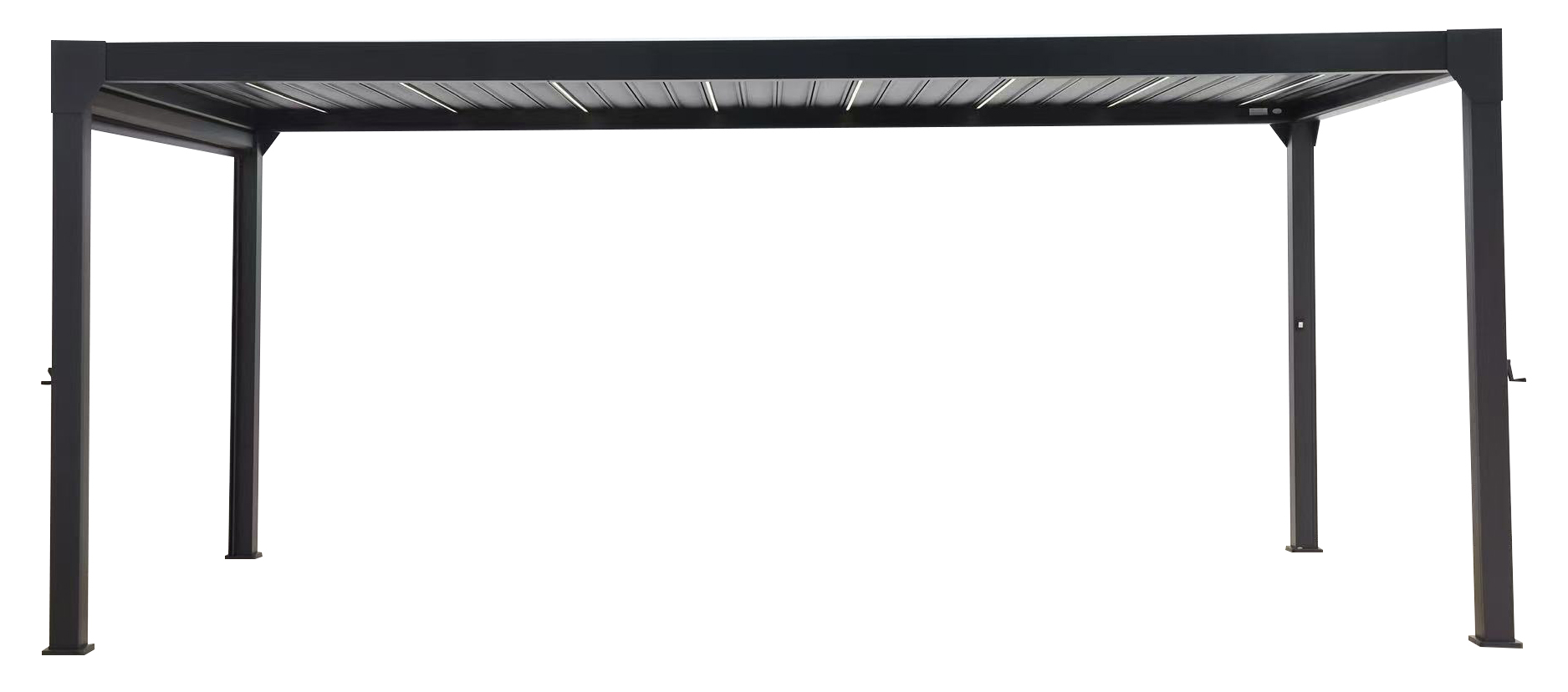 Structure 100% en aluminium avec poteaux robustes de 5 pouces et poutres de toit de 6,5 pouces. Eclairage LED integre dans les lattes du toit pour une ambiance parfaite en soiree. Gouttieres integrees pour ecoulement de l’eau de pluie directement par les poteaux.